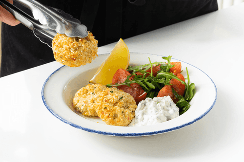 Serve crab cakes hot, with green salad, tartar sauce, and a slice of lemon.