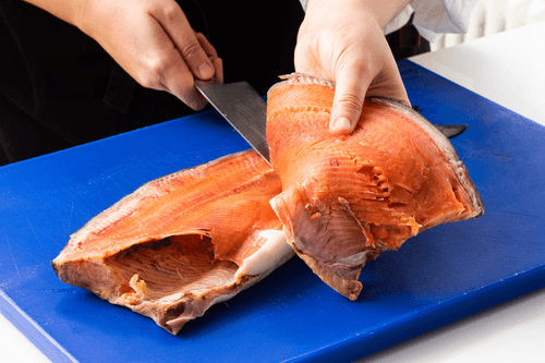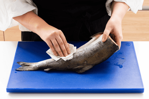 Prepare the fish. Remove the head and entrails. Cut it in half along the spine. Remove the large bones.
