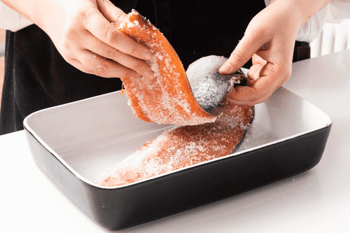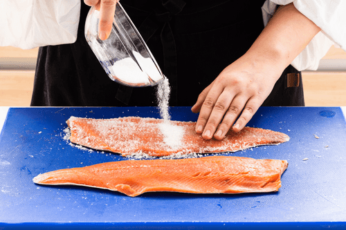 Cover with cling film in contact, press down with a weight, and leave for 3 hours. Then remove the weight and place the fish in the refrigerator for 3 days.