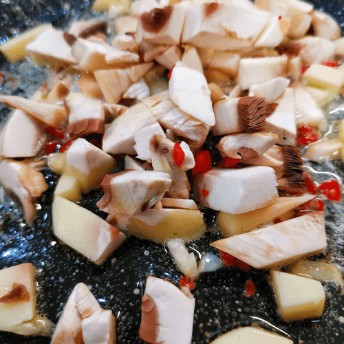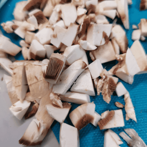 Fry the liver in advance until cooked. Cut the mushrooms.