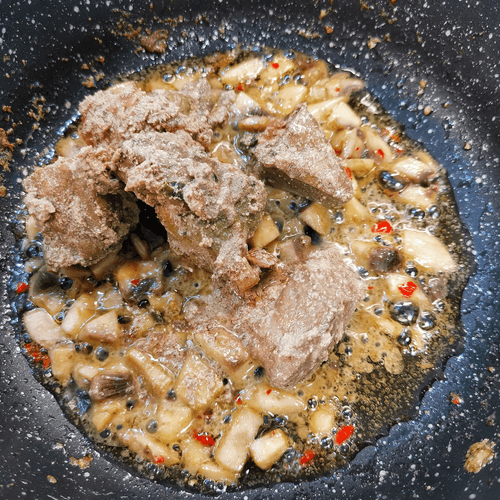 After 5 minutes of constant stirring, add the liver. Cook on medium heat for another 3 minutes.