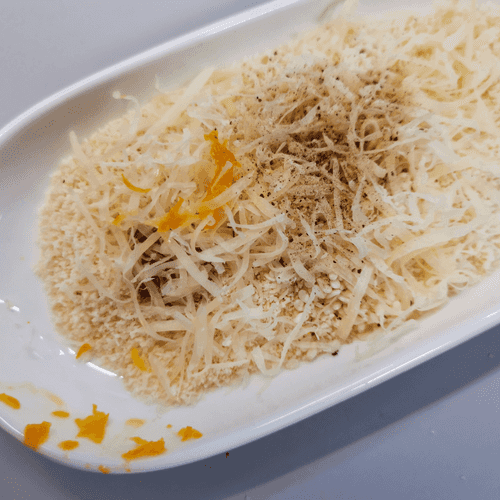 Then add grated cheese, black pepper, and lemon zest.