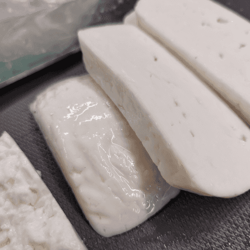 Cut the cheese into slices about 1 cm thick.