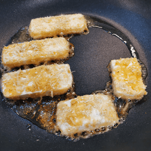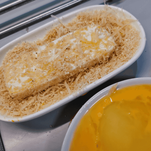 Dip the cheese first in the breading, then in the egg on both sides.