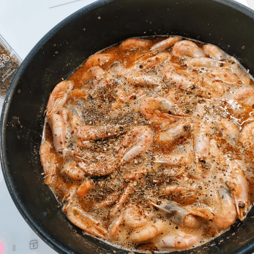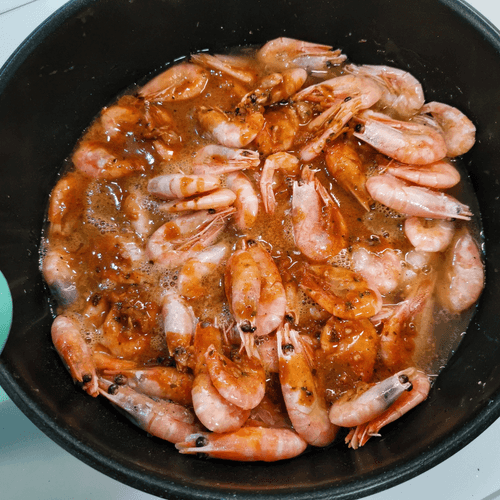Pour the sauce over the shrimp and stir again. Lower the heat a bit.