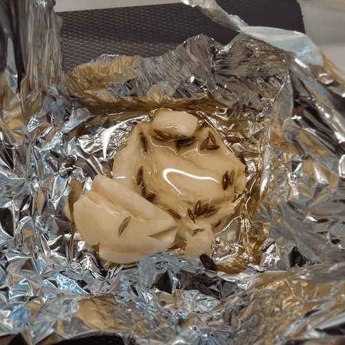 Place the garlic in foil, add half a teaspoon of oil and a pinch of cumin. Wrap it up.