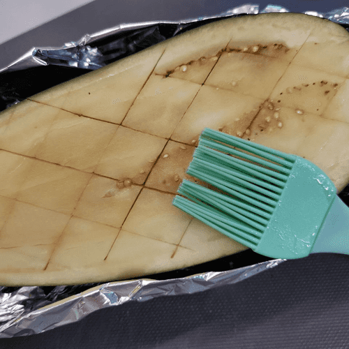 Place half an eggplant in foil, make cuts, and generously coat with oil.