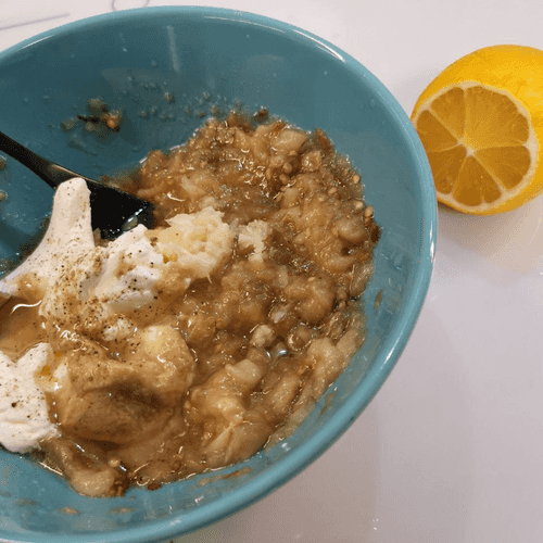 Then add tahini, sour cream, juice of 2 lemon wedges, and press through another clove of fresh garlic.