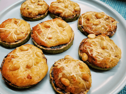 Cheese and garlic zucchini appetizer with pine nuts