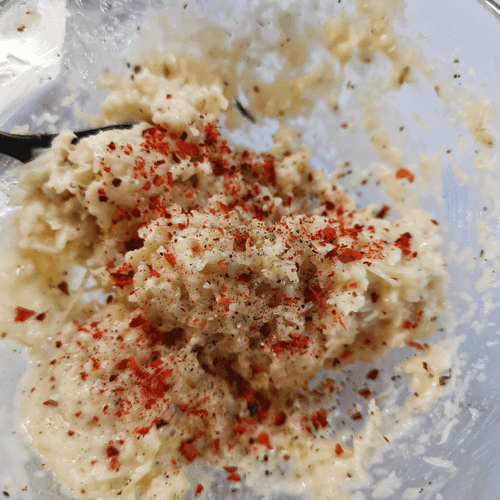 Mix mayonnaise, parmesan, and grated garlic, add chili and ground pepper. Stir.