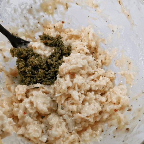 Then add the pesto sauce and mix again.