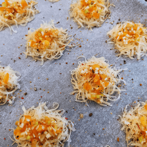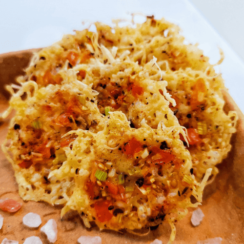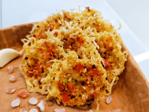Cheese chips with tomato and garlic are a vibrant combination of crispy parmesan with rich aromas of herbs, cherry tomatoes, and spicy garlic. Their origin can be linked to modern gastronomic trends where simple ingredients are transformed into exquisite snacks. These chips have a rich, salty-spicy flavor with a slight tang from the tomatoes and a subtle hint of garlic. They are perfect as a standalone snack or as an accompaniment to wine evenings and festive tables. Quick preparation makes them an excellent choice for unexpected guests. Their crunchy texture and harmonious blend of spices make this recipe a true find for gourmets who appreciate simplicity and sophistication in every bite.