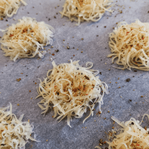 Place portions of cheese about 1 tablespoon in round shape on parchment.