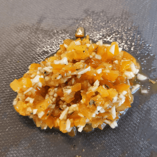 Then mix the onion with tomato and garlic.