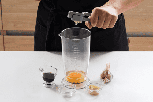 Prepare the sauce. Crack an egg into a tall glass, squeeze in garlic, add soy sauce, pepper, sugar, and mustard. Blend thoroughly.