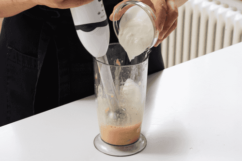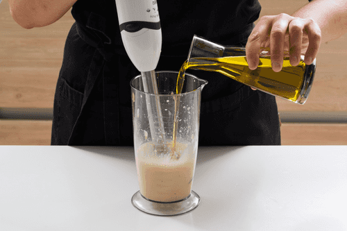 Start pouring the oil in a thin stream while continuously whisking the sauce. Once ¼ of the oil is incorporated, you can increase the speed and pour in the remaining oil more decisively. Place the finished sauce in the refrigerator to thicken slightly.