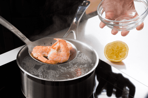 Cut the shrimp's shell and back with scissors, remove the intestine, and boil them in their shell in salted water with lemon juice for 3-4 minutes.