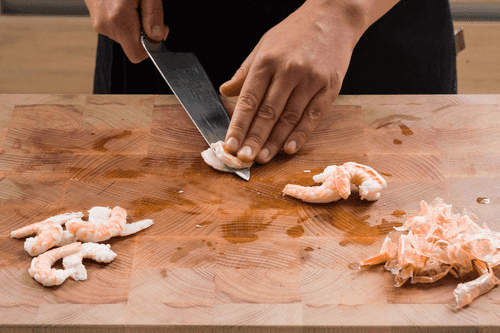 Peel the cooked shrimp and cut them in half lengthwise.