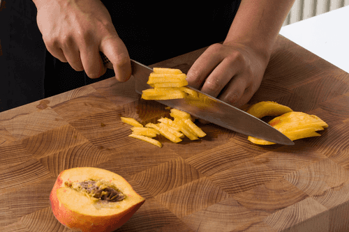 Slice the peach into wedges and peel the skin. Cut the peach wedges into strips.