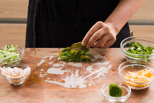 Wrap the filling tightly in the rice paper. Prepare the other spring rolls as well.