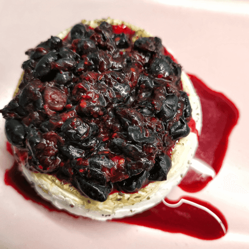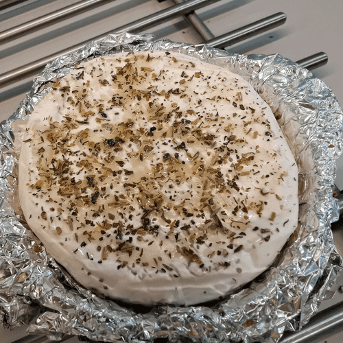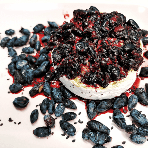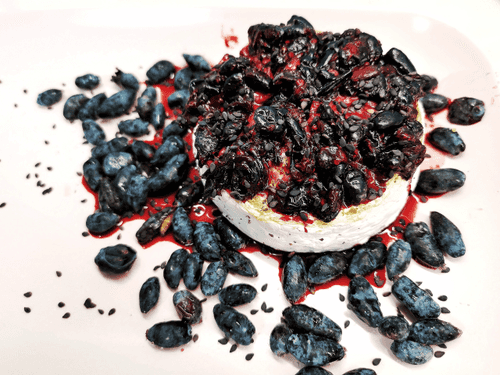 Baked camembert with honeysuckle is a gastronomic masterpiece that combines the tenderness of French cheese with the sweet-sour notes of berries. Camembert, popular in France since the 18th century, becomes creamy and gooey when baked, revealing its rich flavor. Enhanced by honeysuckle—a rare northern berry with a refreshing tartness—it achieves remarkable harmony. Provencal herbs add aroma while black sesame provides subtle textural contrast. This dish is perfect for cozy evenings when one wants to immerse in the world of refined gastronomy, enjoying the melting cheese and vibrant berry flavor combination. It is served immediately after baking alongside fresh bread or crispy crackers. The finished camembert can be cut open to release its juicy filling and enjoyed with berries, salt, and spices.
