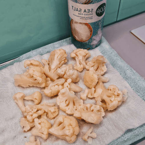 Wash the cauliflower, divide it into florets, and dry it on a paper towel. Add salt.