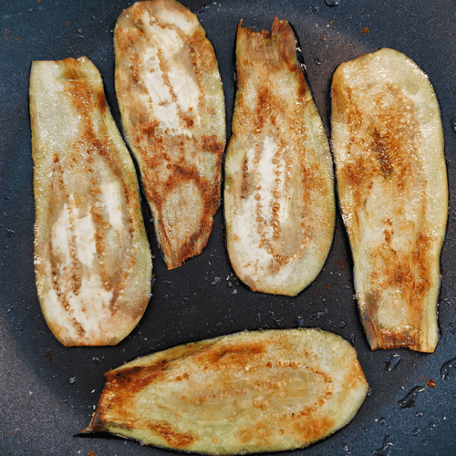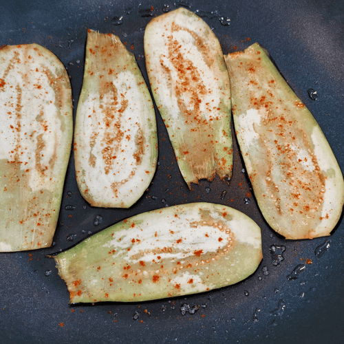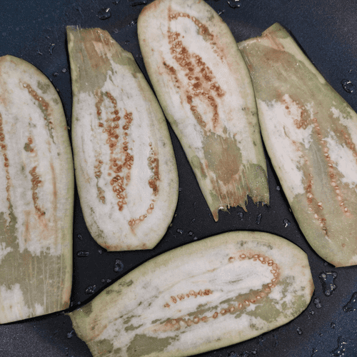 Slice the eggplants thinly and place them in a hot pan with oil and a pinch of coarse sea salt.