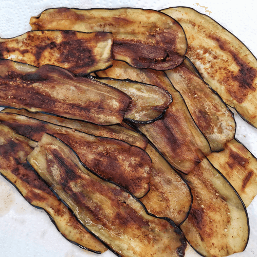 Fry the eggplants until golden brown on both sides and place them on a paper towel. Let them cool slightly.