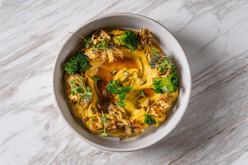 Pumpkin Hummus with Oyster Mushrooms and Broccoli