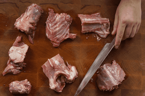 Cut the duck carcass into several small pieces. Trim the duck fat from the body and put it in the refrigerator.