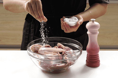 Place the duck parts in a bowl, season with salt and pepper, and mix by hand. Leave in the refrigerator overnight.