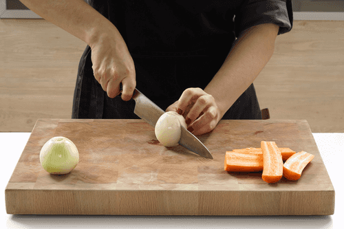 Cut 2 onions in half, and cut the carrot in half or into four pieces if it is large.