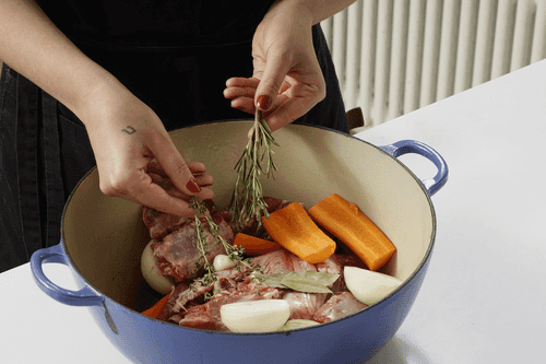 Place vegetables, garlic, bay leaf, spices, and duck in a heatproof dish and mix everything.