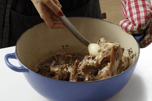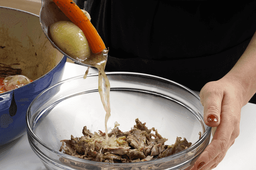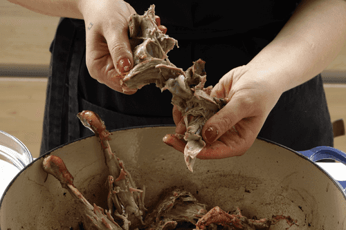 Take the duck out of the oven and let it cool slightly. Separate the meat from the bones. Do this while it's still warm: a cold duck is harder to disassemble.