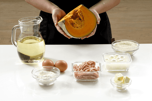From simple, accessible to all products we got beautiful Japanese croquettes. And immediately became the hit of the month in the editorial office. First we baked the pumpkin in the microwave until soft (you can also use the oven), then mashed it with a fork , then combined the pumpkin pulp with minced chicken, then molded croquettes, into which with one simple movement we placed pieces of mozzarella. Croquettes need to be deep-fried in any refined oil, which ultimately gives us many different textures: a crispy crust , motley pieces of pumpkin and minced meat and, as a bonus, stretchy hot mozzarella. It is best to eat this appetizer with some bright Japanese sauce. We recommend tonkatsu or a mixture of mayonnaise with sriracha sauce. Wash it down with beer!