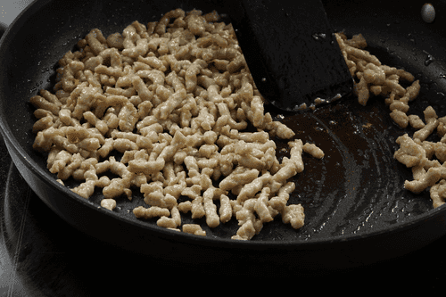 Fry chicken or any other minced meat in a small amount of vegetable oil until cooked, about 10 minutes.
