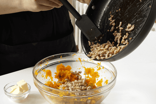 Mash the cooked pumpkin with a fork. Add minced meat and butter. Season with salt and pepper, then mix.
