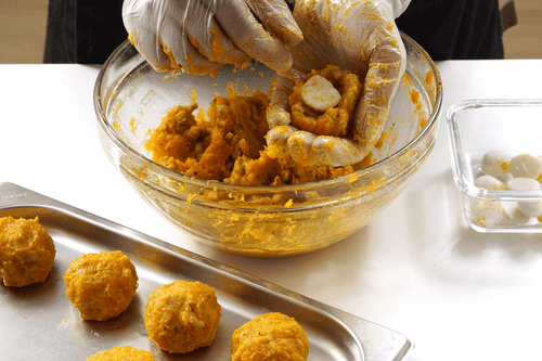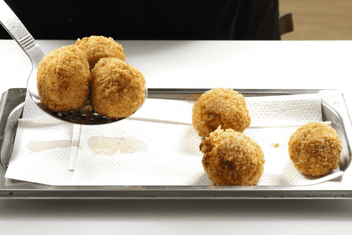 Form croquettes from the mass. Make a dent in the croquette, place half a mozzarella in the center, and shape it into a ball. Do the same with the remaining croquettes.