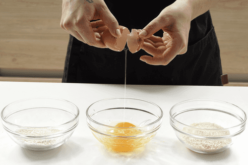 Crack the eggs into a bowl and mix until smooth. In two other bowls, add flour and breadcrumbs.