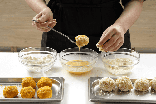 First, coat the croquette in flour, then in eggs, and finally in breadcrumbs.