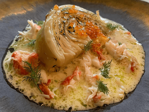 Remove the cabbage from the heat, transfer to plates, and serve with a thick creamy sauce, crab, red caviar, and dill.
