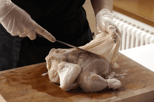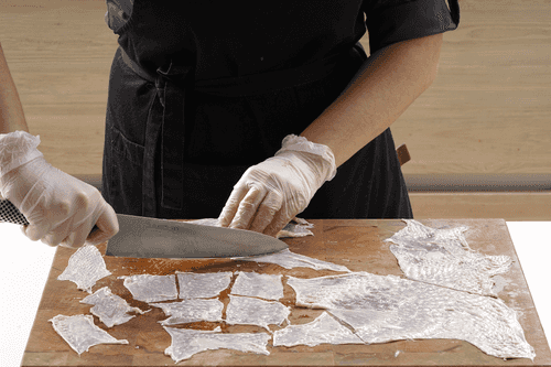 Remove the skin from the chicken using a knife. The recipe only requires the skin; other dishes can be made from the remaining chicken.