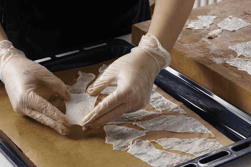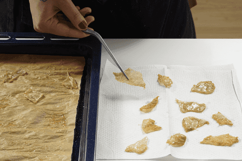 Place the stretched pieces of skin on a baking sheet lined with parchment paper. Salt them.