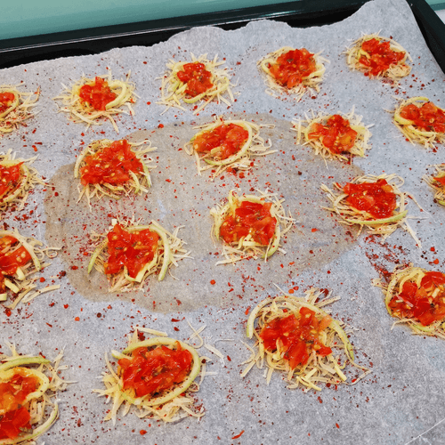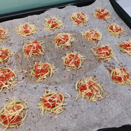 Add a heaping teaspoon of tomato mixture to each 'pile' of cheese.