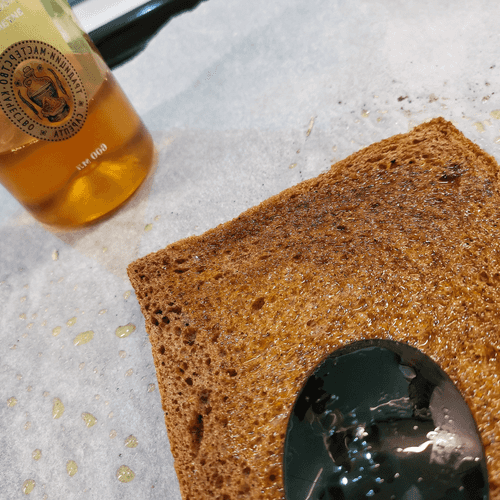 Place a piece of bread on the baking sheet and spread it with mustard oil.