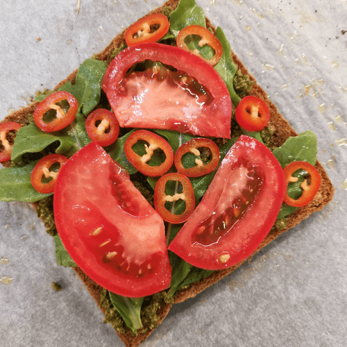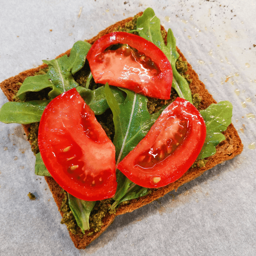 Top with arugula and thin slices of tomato (about 6–8 mm).