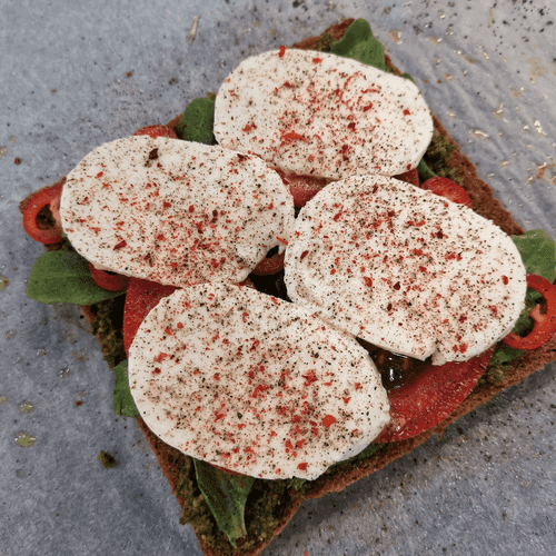 A juicy sandwich with mozzarella and parmesan is a true work of gastronomic art inspired by Italian traditions. It combines the creamy softness of mozzarella, the savory depth of parmesan, and the freshness of arugula with tomatoes. The bread baked to a golden crust, soaked in aromatic pesto and mustard oil, creates the perfect texture: crispy on the outside and tender on the inside. Spicy pepper adds zest while spices balance the flavor. This sandwich is ideal for a light yet hearty snack, especially paired with a cup of freshly brewed coffee or a glass of white wine. Its rich, harmonious taste will captivate those who appreciate quality and simple yet refined dishes. A great choice for breakfast or lunch that will delight anyone who values culinary elegance.