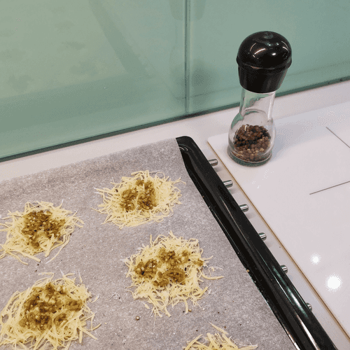 After 5 minutes, remove the baking tray, sprinkle each circle with cheese (about a teaspoon without a heap), and return to the oven for 3-4 minutes.