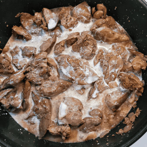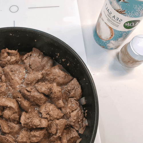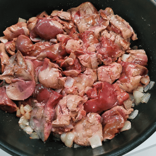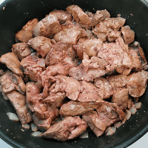 After a minute, stir the onion and add the liver.