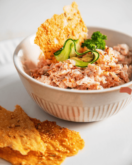 Риет из красной рыбы — изысканный авторский рецепт, сочетающий в себе нежность запечённого филе и кремовую текстуру творожного сыра. Маринованная пряностями рыба, пропитанная ароматом прованских трав и копчёной паприки, обретает насыщенный вкус и мягкость. Лёгкая пикантность свежемолотого перца и чеснока придают блюду особый оттенок. Этот риет прекрасно сочетается с хрустящей фокаччей или мягким хлебом, а тонкие слайсы свежего огурца добавляют свежести. Он идеально подойдёт как для утончённого аперитива, так и для уютного домашнего ужина. Отличный вариант для подачи на праздничном столе, особенно если дополнить блюдо ароматной зеленью петрушки.